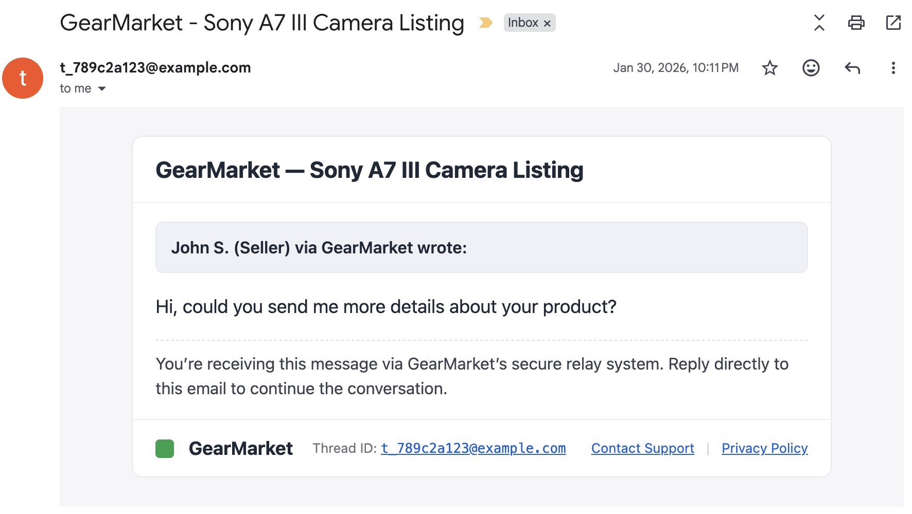 Relay replaces real emails with secure, per-thread aliases. Buyers and sellers never see each other’s personal contact details.